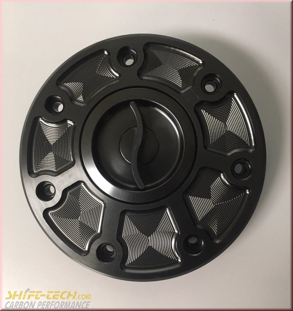 The CNC Aluminium surround has a very nice anodized black finish, and it features TWM's signature CNC machined 1/4 turn quick release cap which was originally invented by TWM. Simply push down the handle and turn it counterclockwise to open the gas/fuel cap. Unlike screw on caps that bind and seize, these quick action caps will work every time like they should and last a lifetime