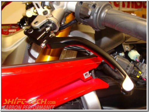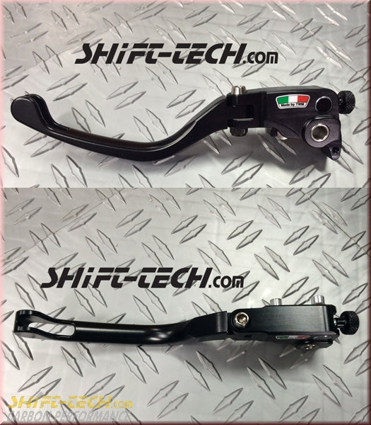 Both the brake and clutch side lever have a folding outer part with "low drag" ends. It took Brembo millions of dollars on research and development to discover and figure out this phenomena. It all started when MotoGP rider Loris Capirossi was experiencing excessive brake fade at the Misano Straight. The problem was solved by incorporating the holes at the end of the levers which are now referred to as "low drag" ends.